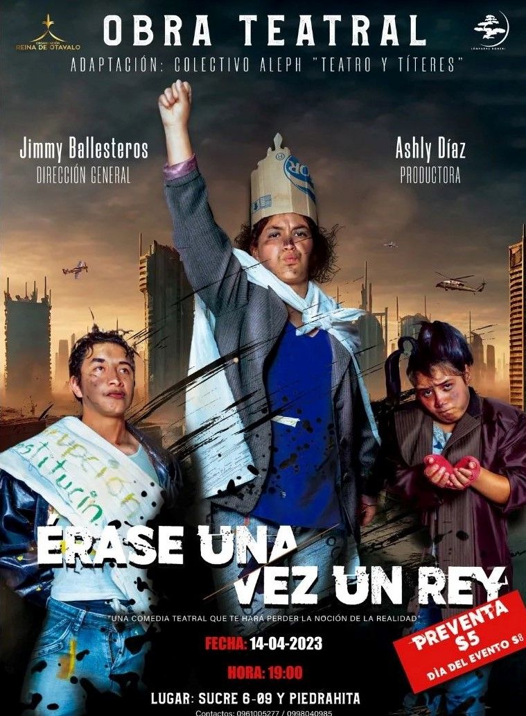 El colectivo Lamparas Bonsai en coordinación y ayuda de la Organización Reina de otavalo presentaron la Obra teatral «Erase Una Vez Un Rey» la cual